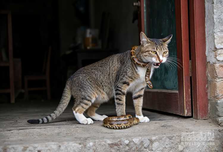 貓與蛇的交鋒,多出于獵奇與游戲。盡管偶爾蛇會成為貓的獵物,但更多時候,貓只是將其當作消遣的玩具。憑借敏捷的身手和快速的反應(yīng),貓在與蛇的對峙中往往占據(jù)上風(fēng)。