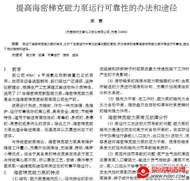 提高海密梯克磁力泵運(yùn)行可靠性的辦法和途徑